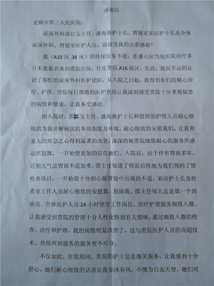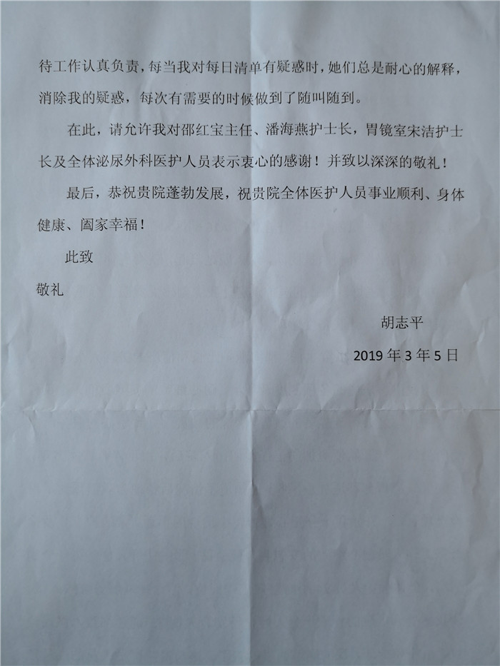 慕名而来 满意而归——致泌尿外科及内镜中心的感谢信