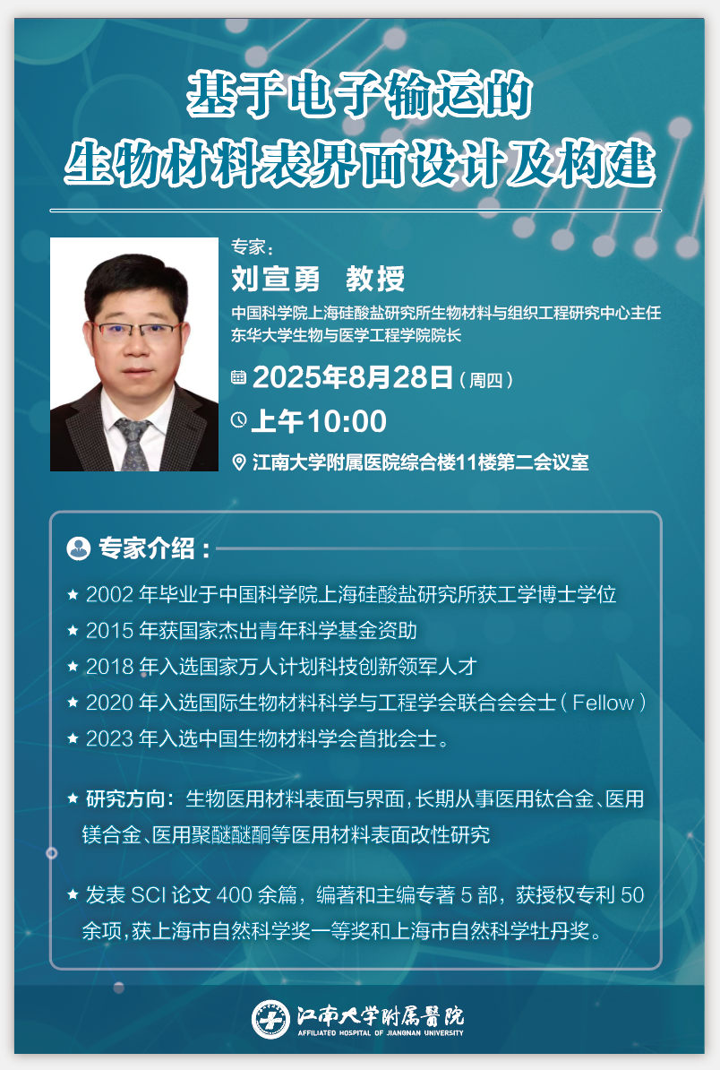 学术讲座 | 基于电子输运的生物材料表界面设计及构建——中国科学院上海硅酸盐研究所刘宣勇教授